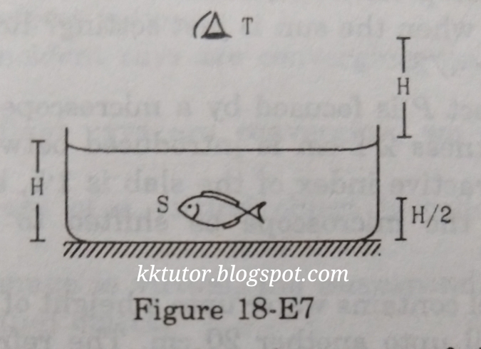 22. Consider the situation in figure (18-E7). The bottom of the pot is a reflecting plane mirror. S is a small fish and T is a human eye. Refractive index of water is µ. (a) At what distance(s) from itself will the fish see the image(s) of the eye? (b) At what distance(s) from itself will the eye see the image(s) of the fish?